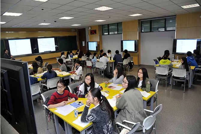 3月21日晚,华中师大8号教学楼,代晋军的高等数学课同时在9个“智慧教室”开讲。每个教室都约有40名员工,他们分成6个小组,围坐在6个电子屏边,时而紧盯屏幕听课,时而点击手机答题。