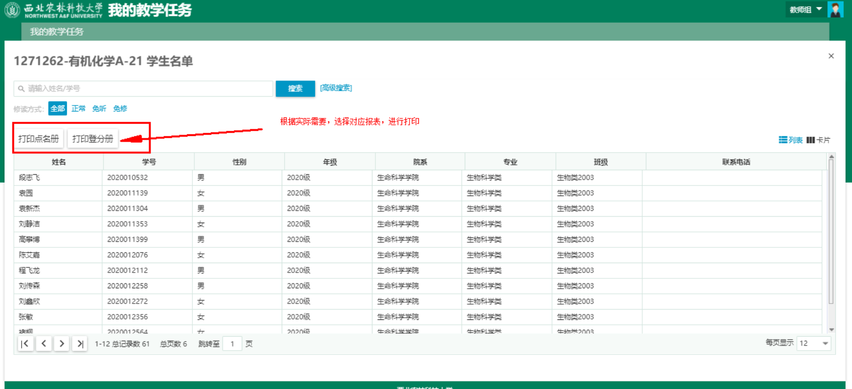 进入应用首页后,默认显示当前教师相关的教学任务, 点击任务后侧的‘员工名单’按钮,可以查看、打印相应名单。