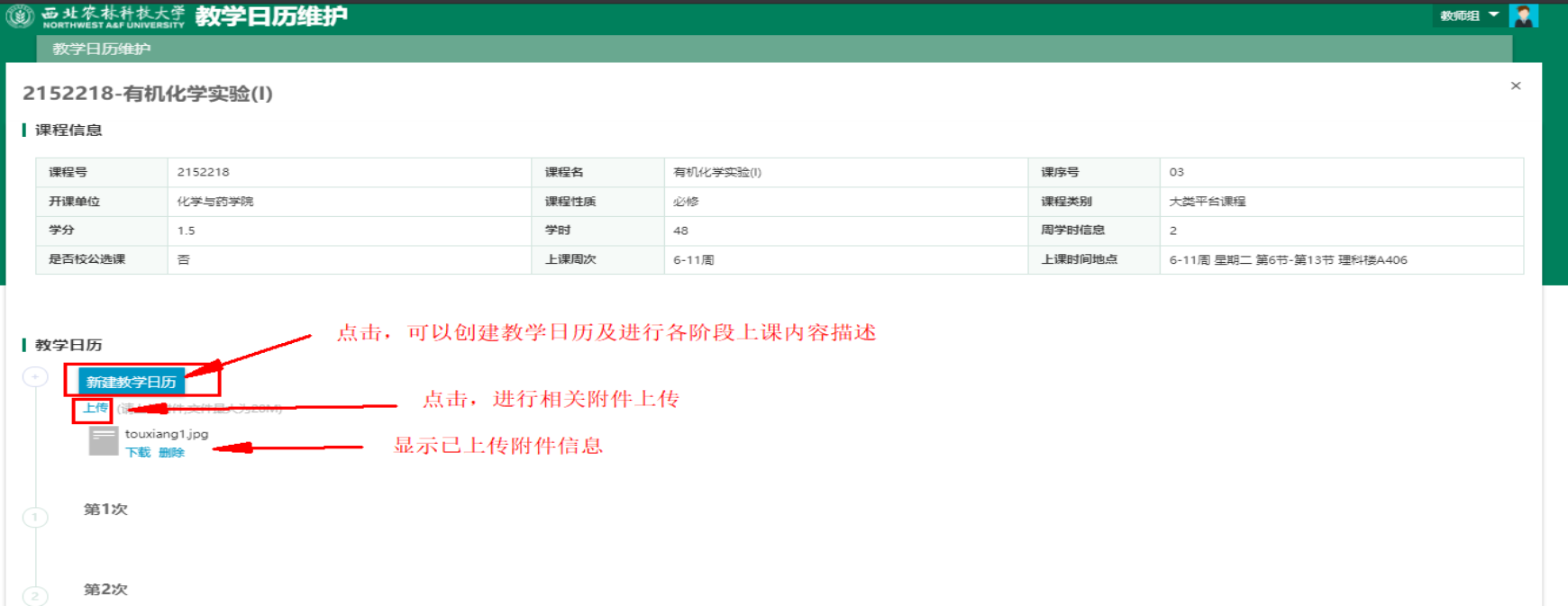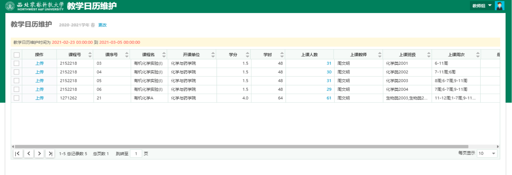 点击列表数据左侧的‘上传’按钮,进入该教学班教学日历的维护页面。