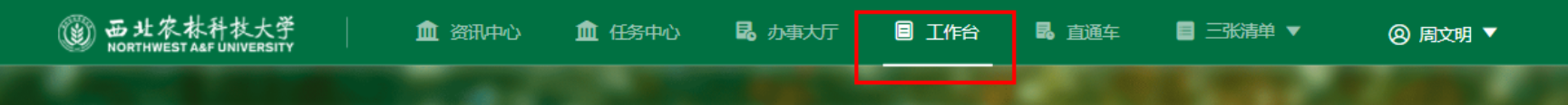 登录成功后,点击顶部导航栏中的‘工作台’,选择并点击‘本科教务’,页面下方展开显示对当前账号开放应用。