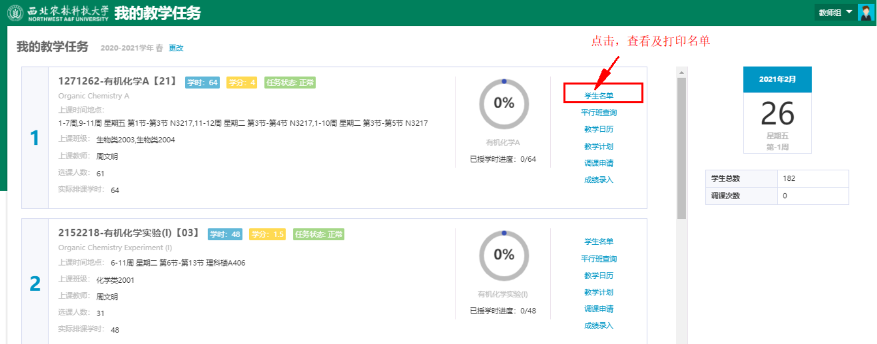 上课老师进入教学日历维护应用后,首页列表默认展示老师自己的任课教学班的信息。