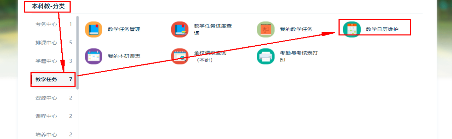登录成功后,点击顶部导航栏的‘工作台,选择‘本科教务’分类—》左侧点击‘教学任务’——》右侧展开,点击‘教学日历维护’,进入应用。