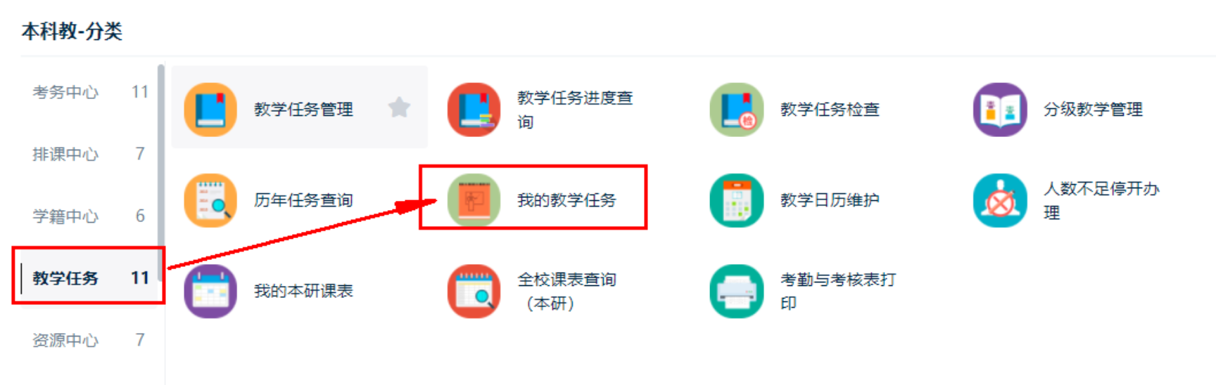 登录成功后,点击顶部导航栏的‘工作台,选择‘本科教务’分类—》左侧点击‘教学任务’——》右侧展开,点击‘我的教学任务’,进入应用。