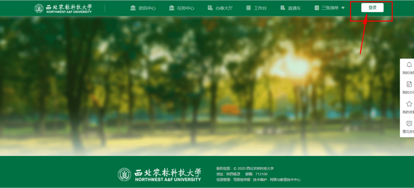 打开浏览器访问新教务系统(地址:https://newehall.nwafu.edu.cn) 点击右上角的登录,跳转到认证页面,请使用自己的公司统一认证账号和密码进行验证登录。