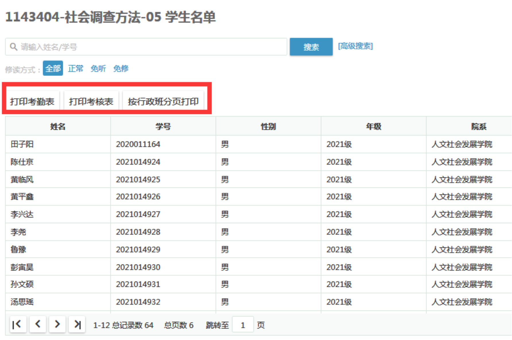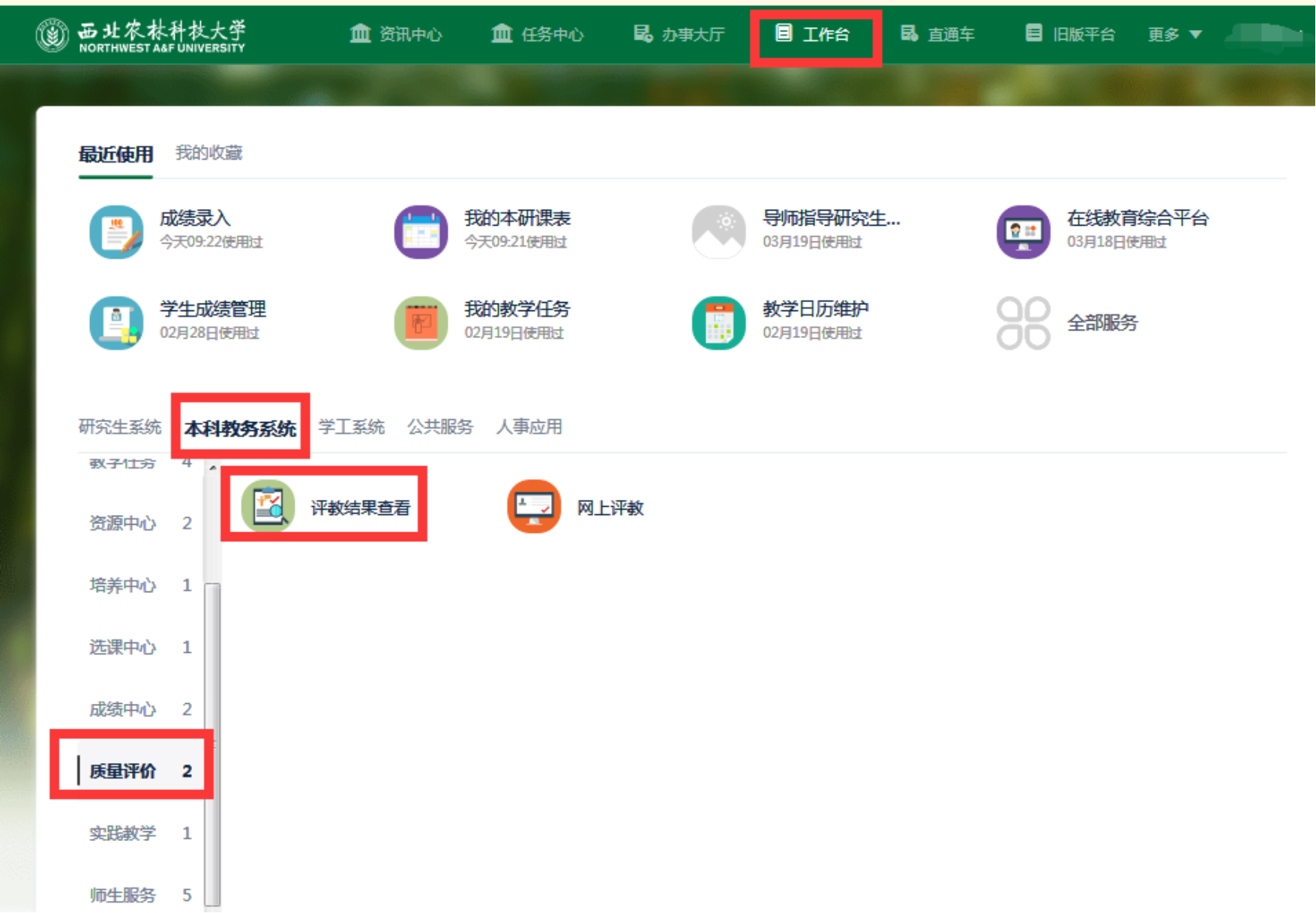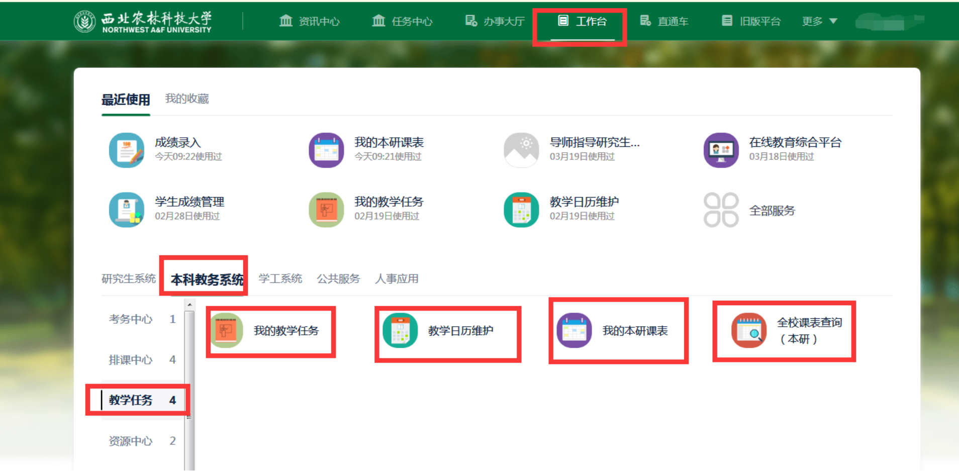 教师打印考核表、考勤表、录入成绩、查询全校课表、教学日历维护、成绩变更、查看评教结果、员工免听免修审核操作截图(要注意最上方学年学期的选择)