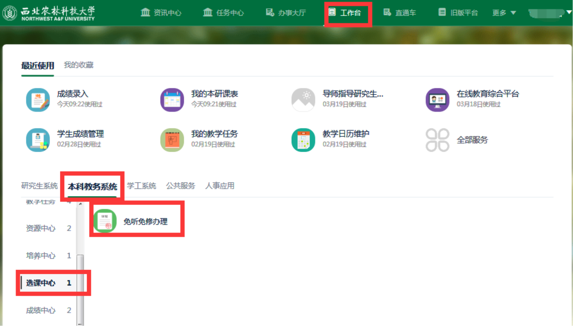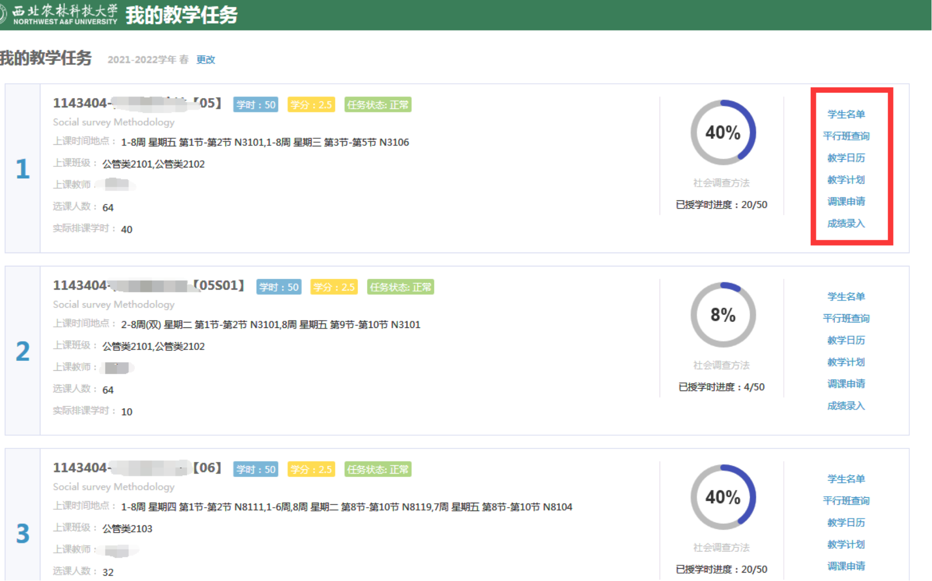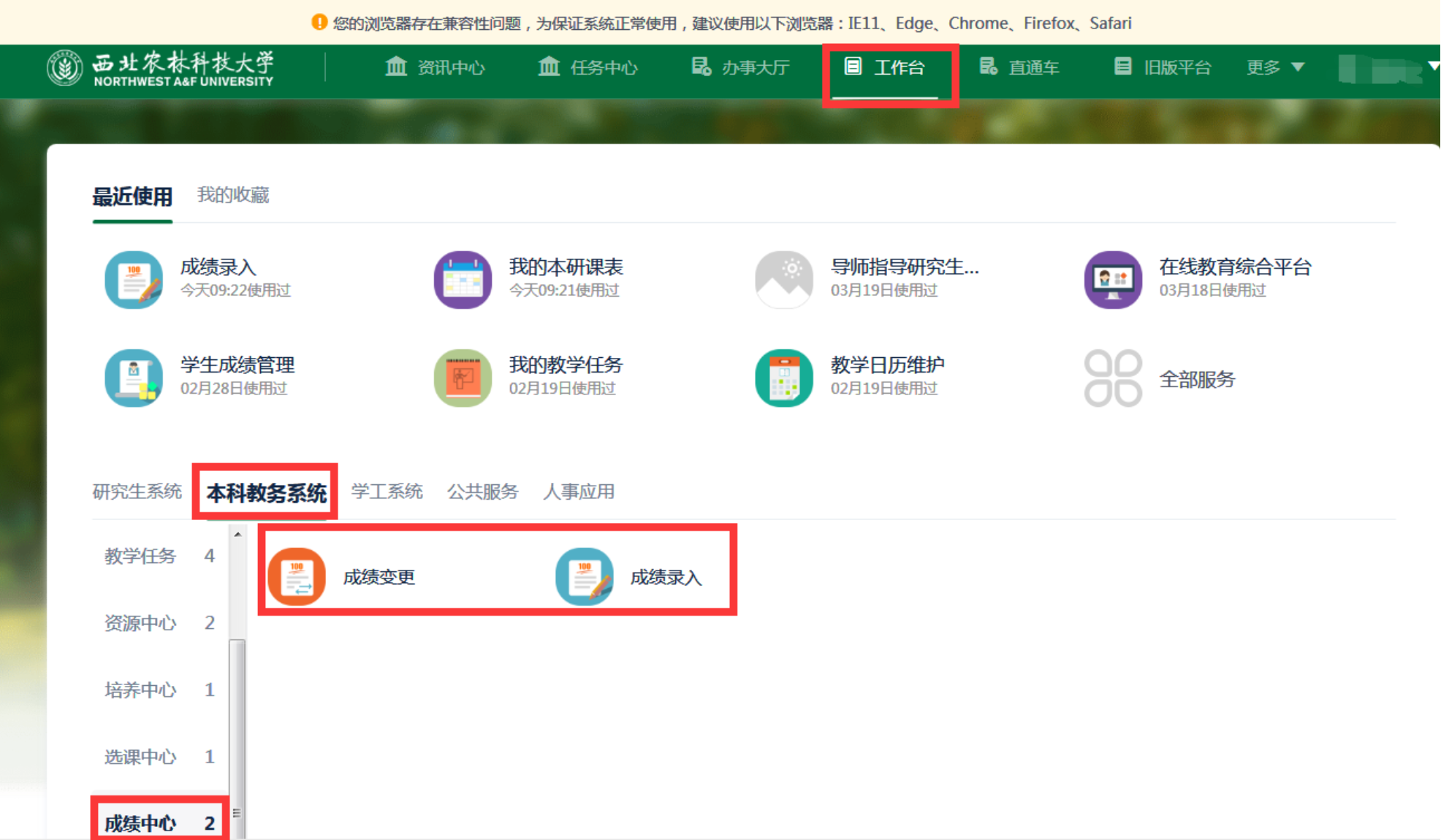 教师打印考核表、考勤表、录入成绩、查询全校课表、教学日历维护、成绩变更、查看评教结果、员工免听免修审核操作截图(要注意最上方学年学期的选择)