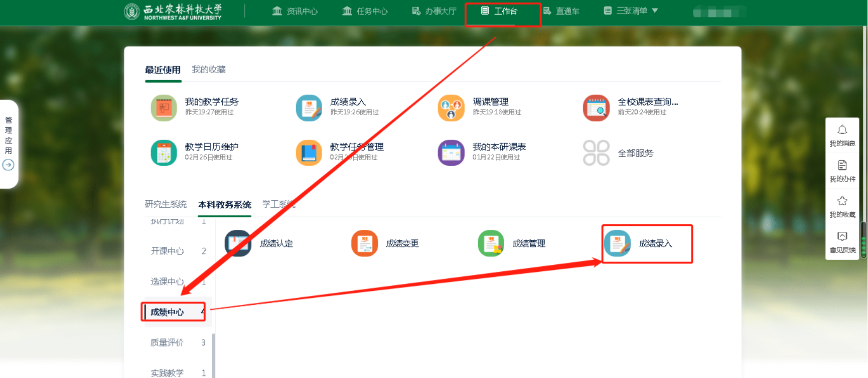 登录成功后,点击顶部导航栏中的‘工作台’,选择并点击‘本科教务’,页面下方展开显示对当前账号开放应用。然后根据实际需要,选择点击应用名称,进入应用中,可进行相关管理操作。
