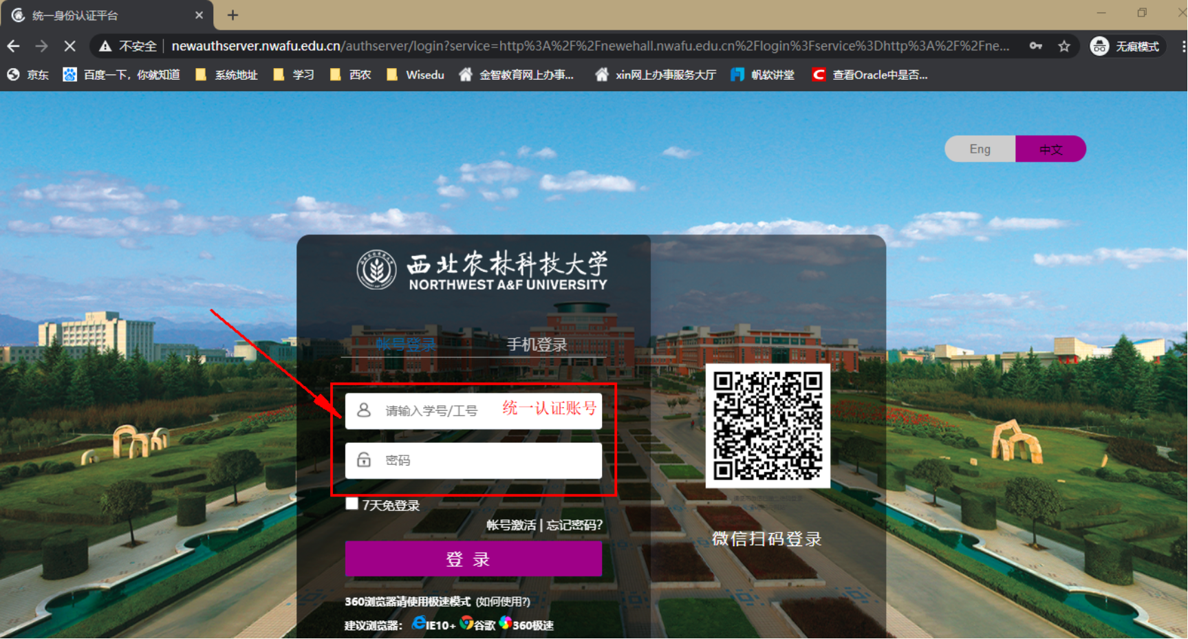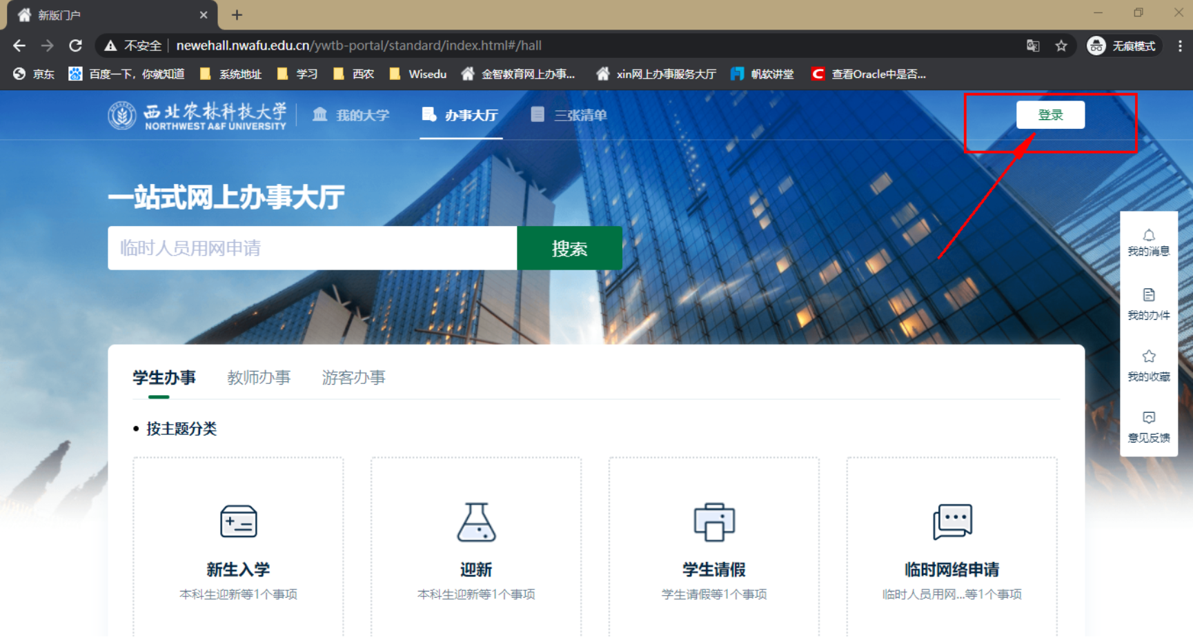 打开浏览器访问新教务系统(地址:http://newehall.nwafu.edu.cn/) 点击右上角的登录,跳转到认证页面,请使用自己的公司统一认证账号和密码进行验证登录。