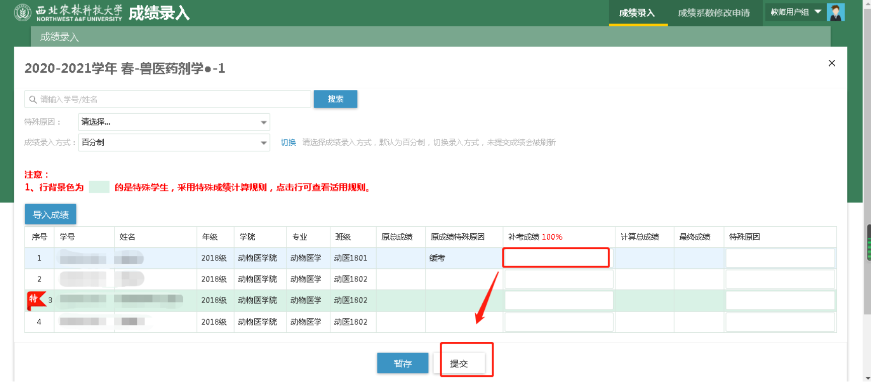 由于新旧系统替换,新系统中没有上学期的教学班数据,且未在新系统录入成绩,而是通过成绩迁移的方式将成绩迁移到了新系统,无法将缓考员工与补考员工在录入成绩系数区别开来,所以特殊原因为缓考的员工,需老师计算好总成绩后,再录入到补考成绩列。