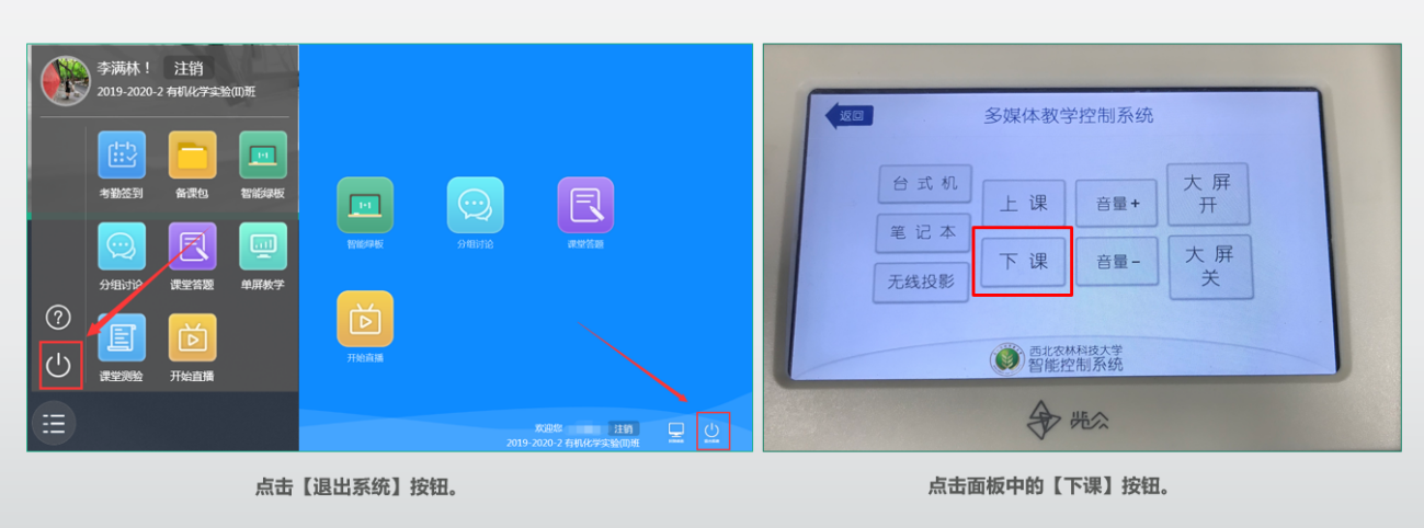 13、教师结束授课后,退出系统,点击面板中的【下课】按钮,关闭设备,离开教室。