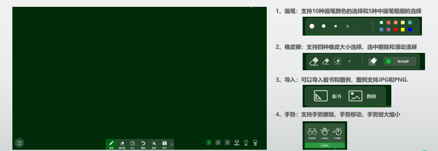 8、教师课中使用 【智能绿板】,进行板书书写,同时支持三块无限放大的黑板。(注意:如果使用的是【双板教学】,系统默认只采集主屏画面,如需向员工展示板书,需要点击【屏幕交换】按钮。)