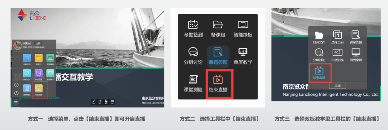 12、教师结束授课后,点击【结束直播】。教师可在以下方式中任选一种。