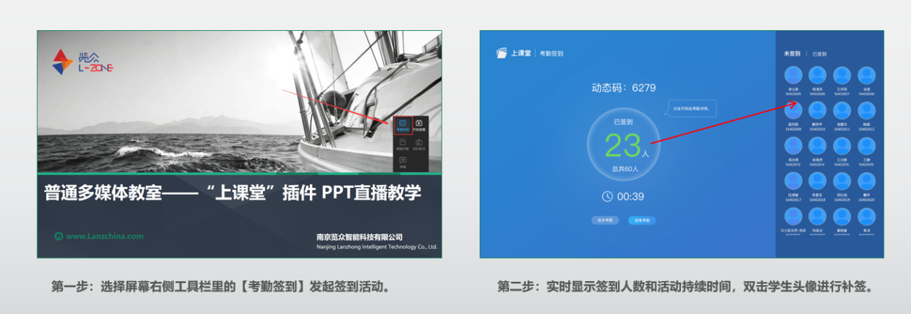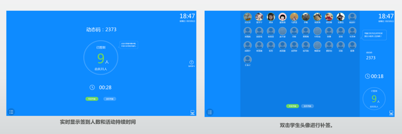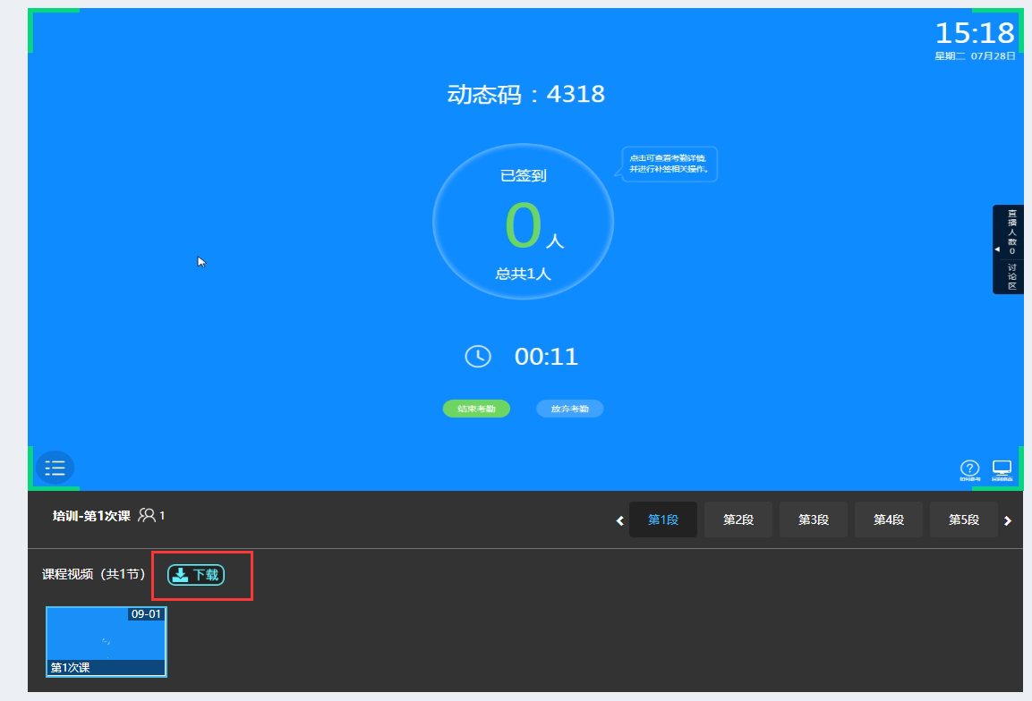 7、教师发起【考勤签到】,员工通过动态码或签到按钮进行签到,一堂课中可以发起多次签到活动,支持补签(老师双击员工头像,进行现场补签,课后老师也可以在教学中心手动修改签到状态)。