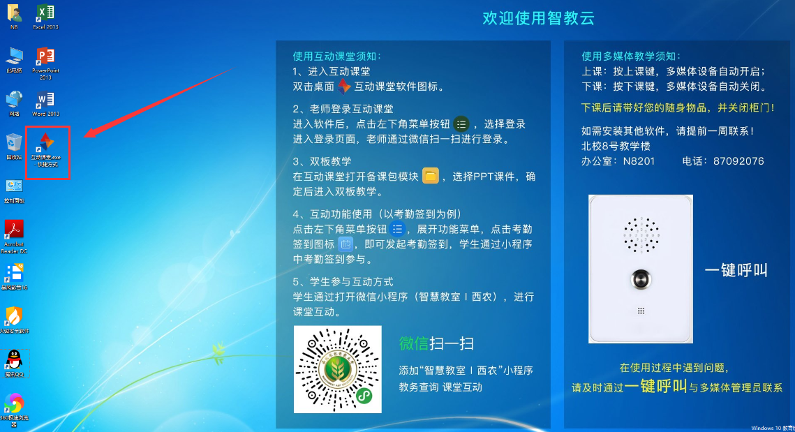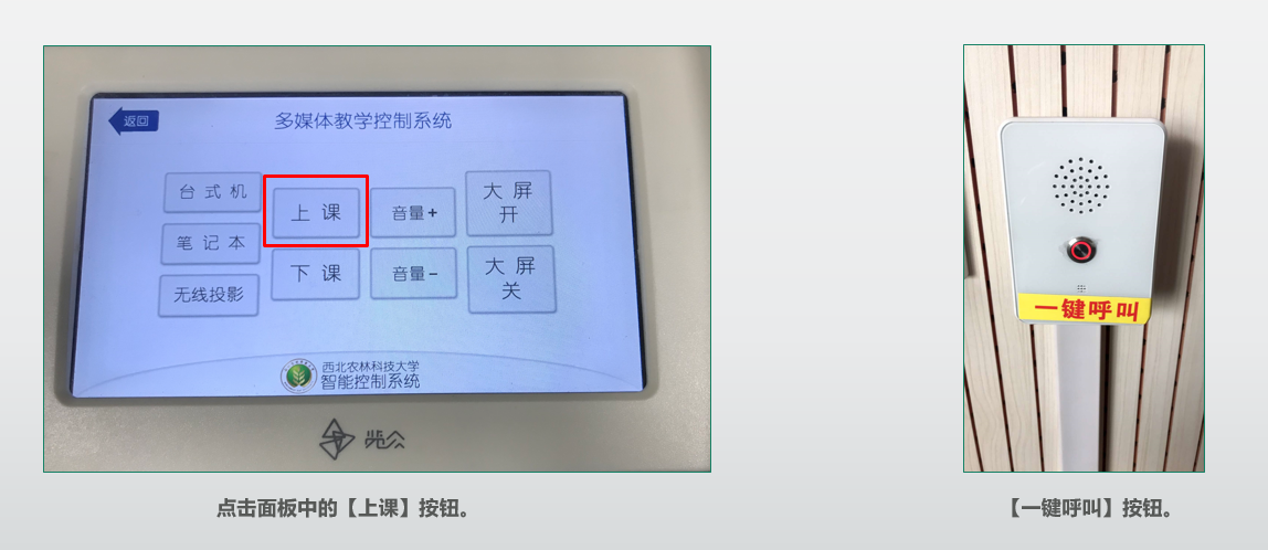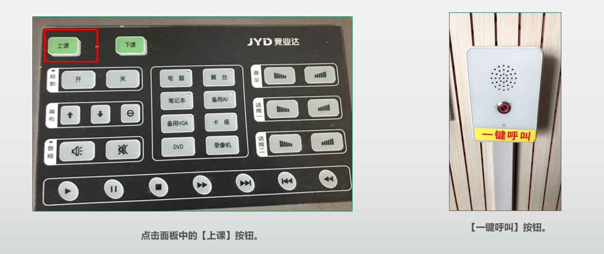 1、教师进入多媒体教室,点击面板中的【上课】按钮,打开教室设备。 (如遇设备问题,在教室中找到【一键呼叫】按钮,联系现场工作人员。)