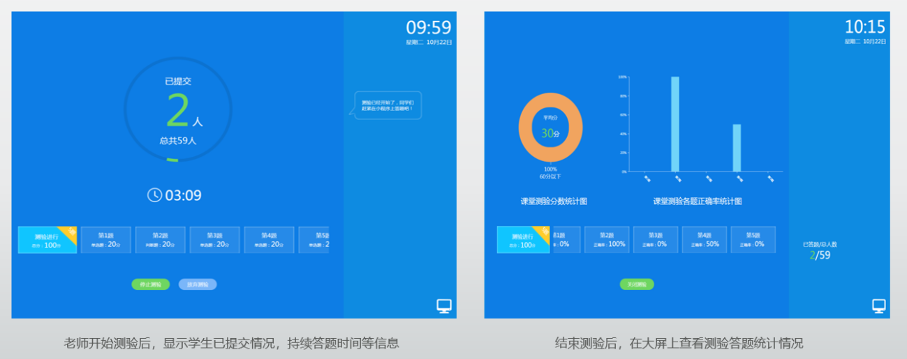 11、教师发起【课堂测验】,员工通过小程序参与课堂测验,停止测验后,老师可在大屏上查看此次测验统计情况。 (注意:需要先在教学中心的【我的题库】里添加题目,在【备课包】的【作业/测验】里添加测验题目。