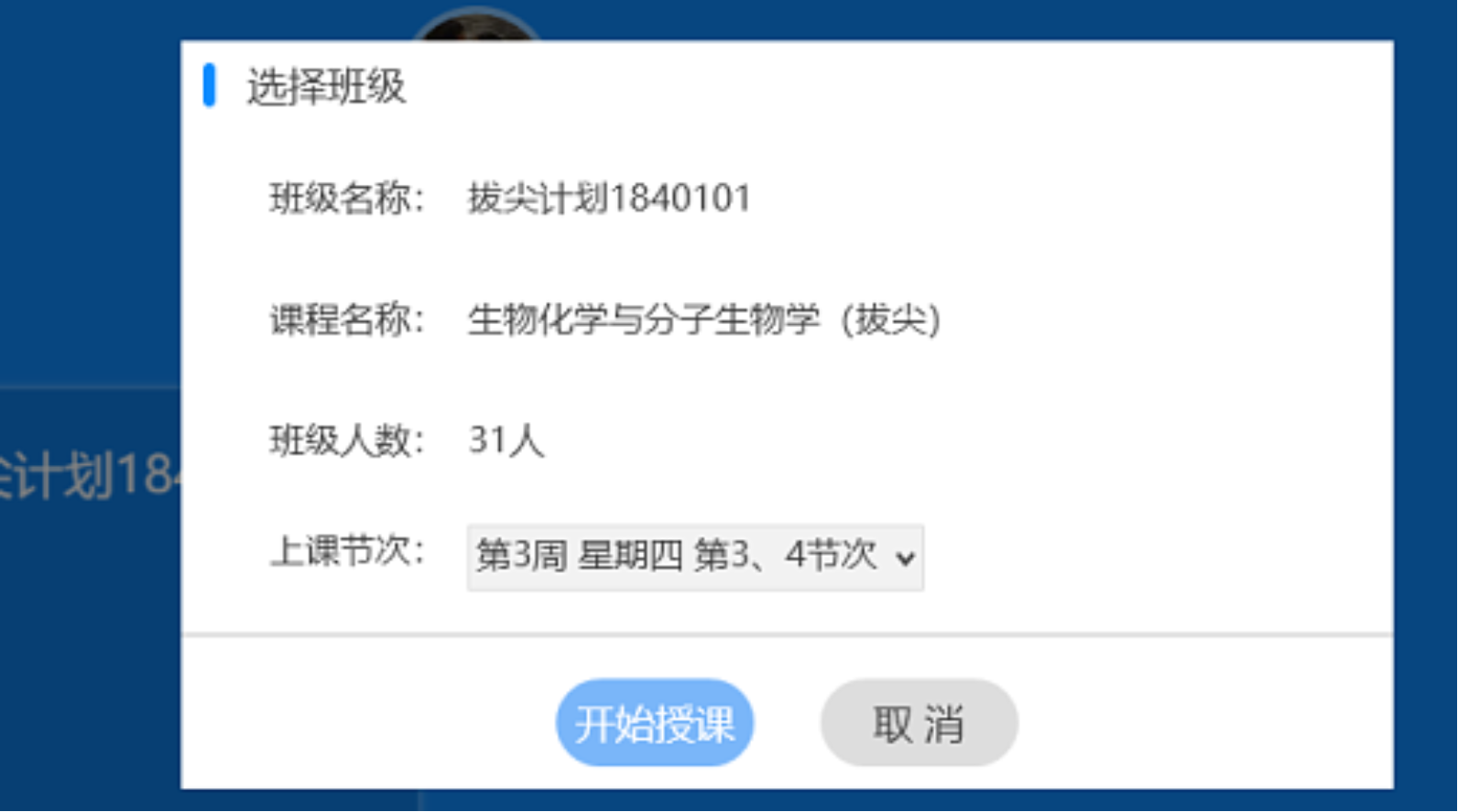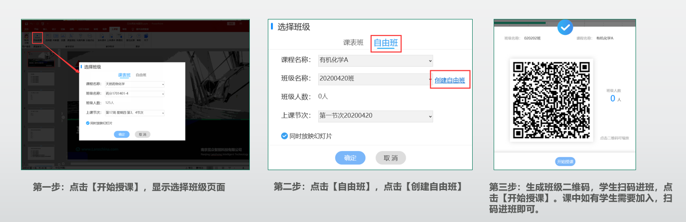 3、登录成功后,点击【开始授课】,进入【选择班级】页面,课表班核对信息后点击【确定】,如果需要新建自由班,则操作第二步和第三步。