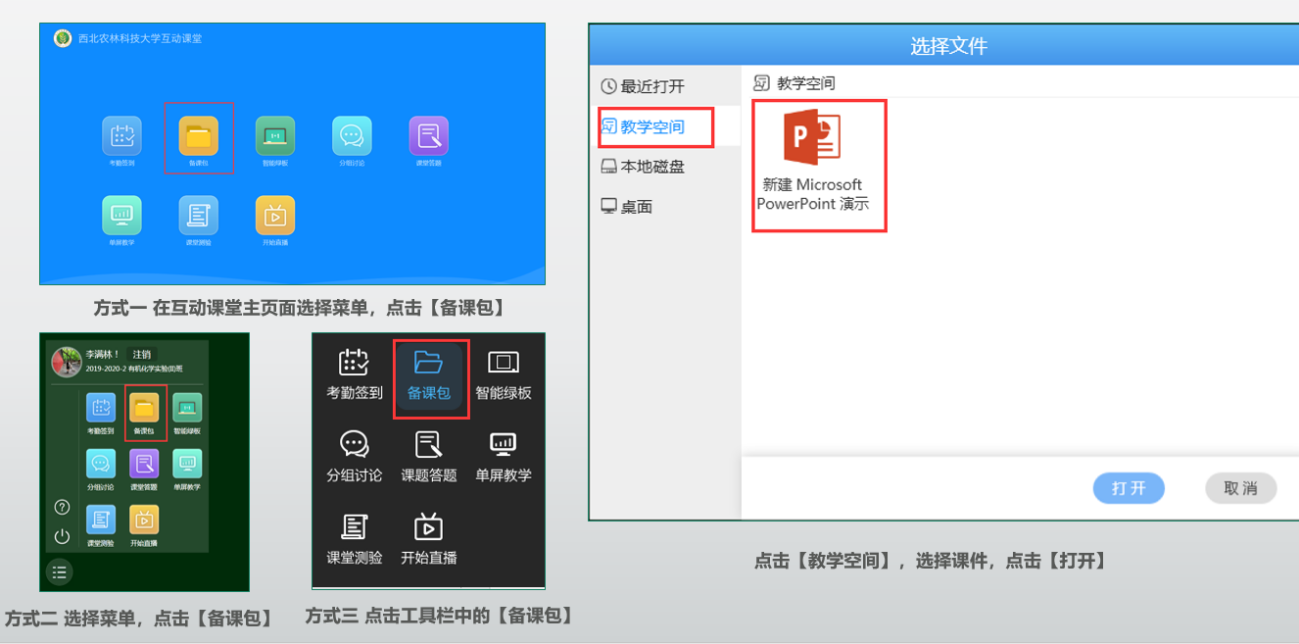 6、教师通过【备课包】打开课件,开始授课。教师可通过以下任意一种方式打开“备课包”。教师也可以使用优盘或移动硬盘打开课件。