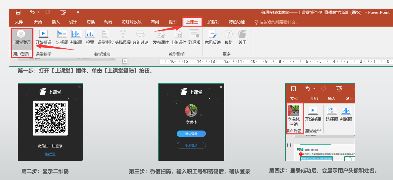 2、教师打开PPT并登录【上课堂】插件。
