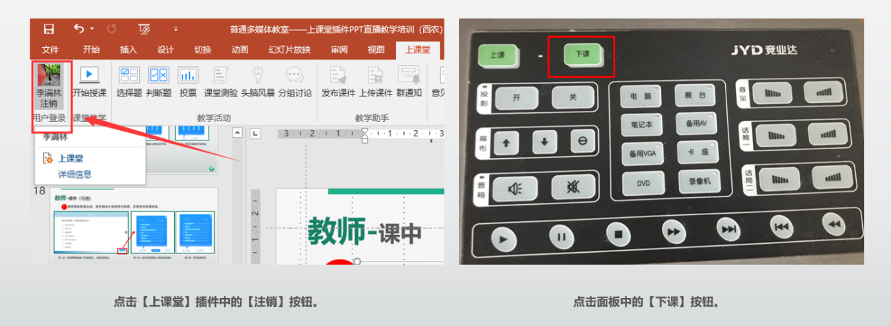 9、教师结束授课后,点击【上课堂】插件的【注销】,点击面板中的【下课】按钮,关闭设备,离开教室。