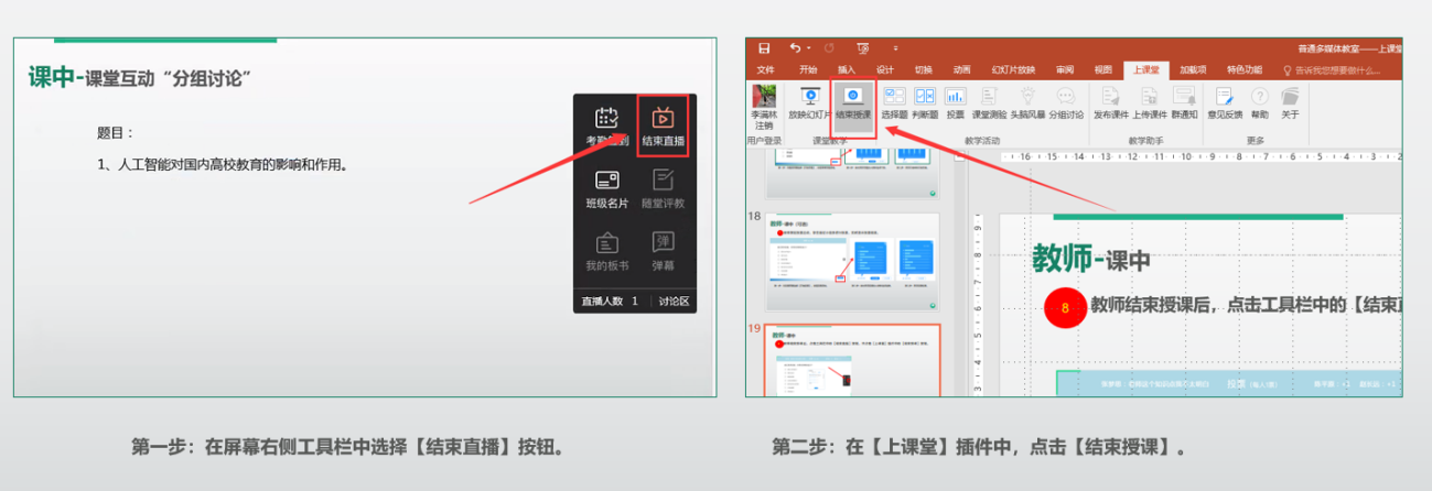8、教师结束授课后,点击工具栏中的【结束直播】按钮,并点击【上课堂】插件中的【结束授课】按钮。