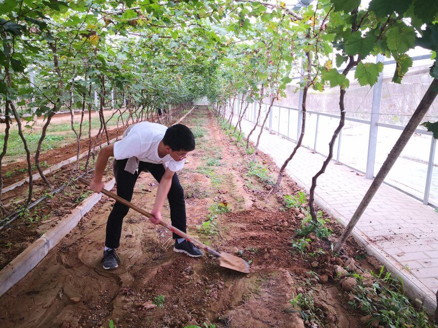 这已是本月的第三次活动。下午3点,队员们来到杨凌君渡农业专业合作社。拿着铁锹走进葡萄大棚,开始了这一次的劳动。这一次的主要任务是对浇过水的葡萄进行翻土。在葡萄浇水的过程中土壤会形成许多小渠沟,为了便于葡萄更好的生长,需将土壤翻平。在李师傅的讲解和示范之后,队员们开始实际操作起来。