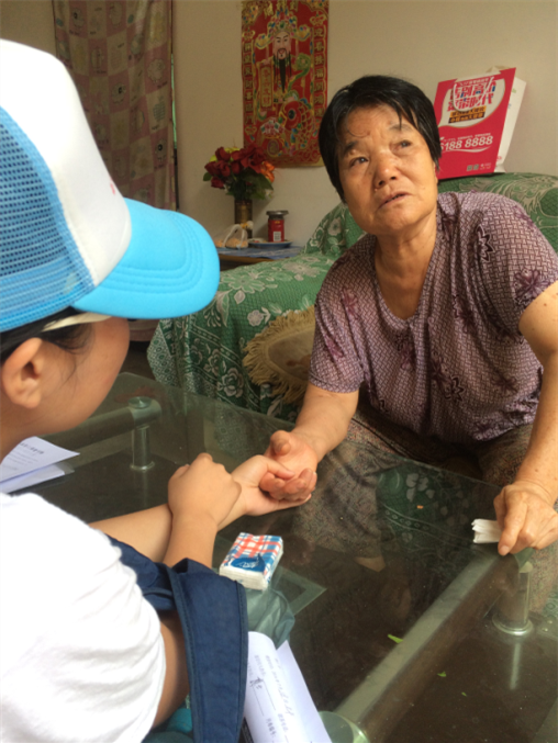 突然改变的天气仿佛也预示着,这一次调研肯定会发生一些特别的事情。果然,我们第一个采访的是一位特别善良和热情的老奶奶。但在采访的过程中,我们也了解到她过去一些令人悲痛的经历。看着奶奶泪流不止的双眼,我们一时竟不知作如何回答,沉默片刻后,我们握紧奶奶的手,向奶奶承诺我们定为此付出我们的努力。也许我们的举动换来的成效微乎其微,但我们相信尽力尝试总会有希望。后来,我们还遇到了一位患了抑郁症的大娘。采访完后,我们组员都留下自己的电话号码,让她一来西农便联系我们。