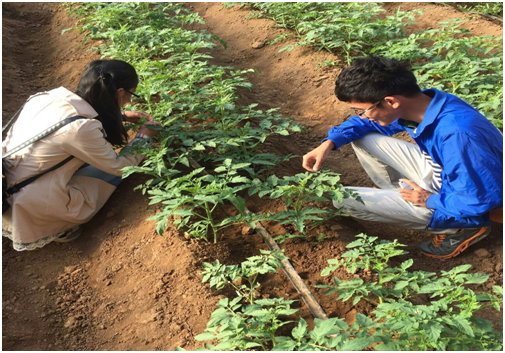 和合作社负责人寒暄过后,队员们便进入了温室大棚内。不同于上学期的葡萄新芽,阔别近2个月的大棚迎来了新“主人”——西红柿。一簇一簇的西红柿新苗,整整齐齐地排列在田埂上。一眼望过去,一片翠绿俏生生的样子,健康地茁壮生长着,仿佛能预见挂满果儿的日子。今天的任务则是对正在生长期的西红柿幼苗进行修整,拔除苗上有些受到自然损伤的枯叶部分,以促进日后结果和果实生长。通过社长和队员们的交流,队员们得知它们将在10月末左右的时候成熟,一般可以保存一个月的时间,如果在冷藏条件下还可以保存得更久。社长的介绍也让大家更好的了解合作社的下一步计划,队员们在学习的同时,也简单的提出了自己的见解。