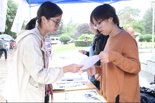 活动仍在进行,天空已飘起小雨。气温骤降,工作人员们仍然打起精神,在寒风中冒雨宣传还有一些学长索性直接拿起了报名表,到路上去宣传介绍,招揽参赛选手。
