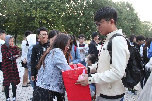 随后,在工作人员的引导下,同学们在抽奖箱前有序排队抽取奖品,怀着期待的心情打开所抽到的纸条,检验着自己的运气。工作人员及时将奖品分发到同学们手中,并送上对同学们的鼓励与祝福。一块西农月饼,一根棒棒糖,既是对早起的激励,也是对即将到来的节日的真挚馈赠,暖心的奖品和祝福使现场充满了温暖向上的氛围,获得在场同学的一致好评。