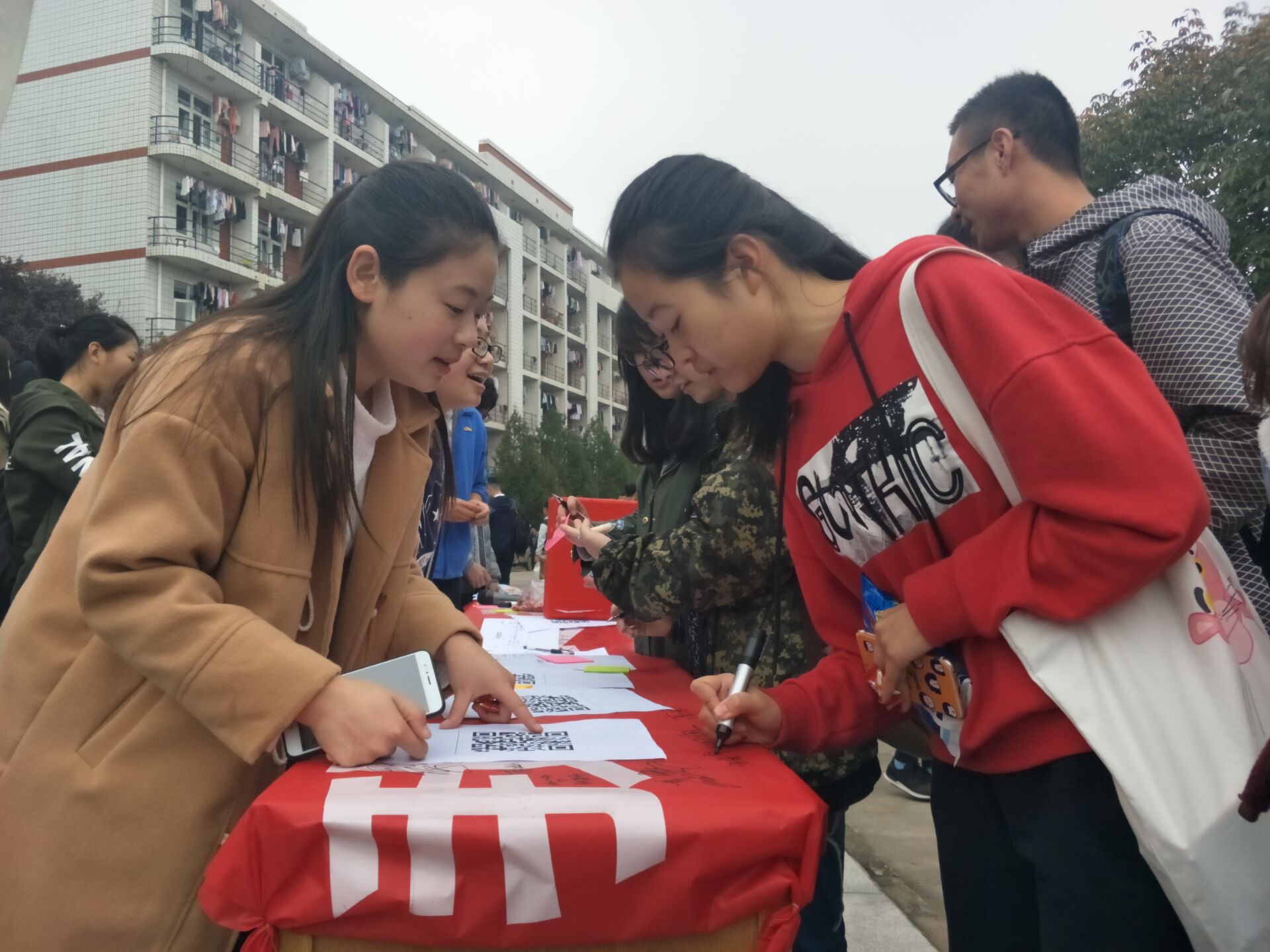 活动开始前,工作人员提前绘制好各食堂平面图以及标明具体窗口的经营内容,为同学评议提供一定参考依据,并事先联系食堂工作人员,争取他们对本次活动的配合与支持,为活动开展奠定良好基础。一切工作准备就绪后,工作人员在路上向过往员工介绍食堂评议的重要性和具体内容,邀请员工们通过扫描二维码参与问卷调查。同学们相互讨论对于食堂服务的看法,根据日常就餐体验认真写下对食堂服务的意见。工作人员各司其职,在各自负责的区域有条不紊地完成好朗读宣传稿、招揽同学参与以及指导同学完成评议等一系列工作,共同促进了本次活动的顺利开展。