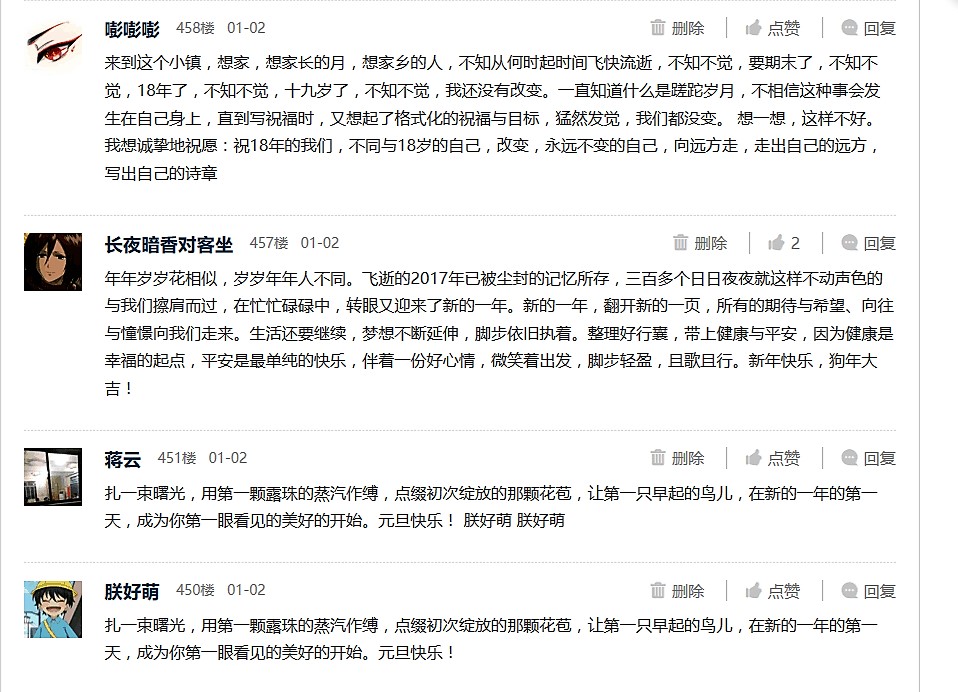 为欢度元旦佳节,营造美好的新年氛围,让大家表达对新年的美好祝福。人文易班工作站推出“元旦祝福语”活动,通过易班App,让同学们在“元旦福利”轻应用里留下对新年的美好祝福语。同学们积极地参与活动,纷纷留下了自己的美好祝福,活动结束时页面访问量达670,独立访客总量达550,评论数达470条。最后人文易班工作站对优秀的祝福语进行奖励,看到获奖同学们的动人笑容,感觉到易班这个平台对同学们具有很大的意义,让同学们在元旦佳节获得了满满的幸福感。