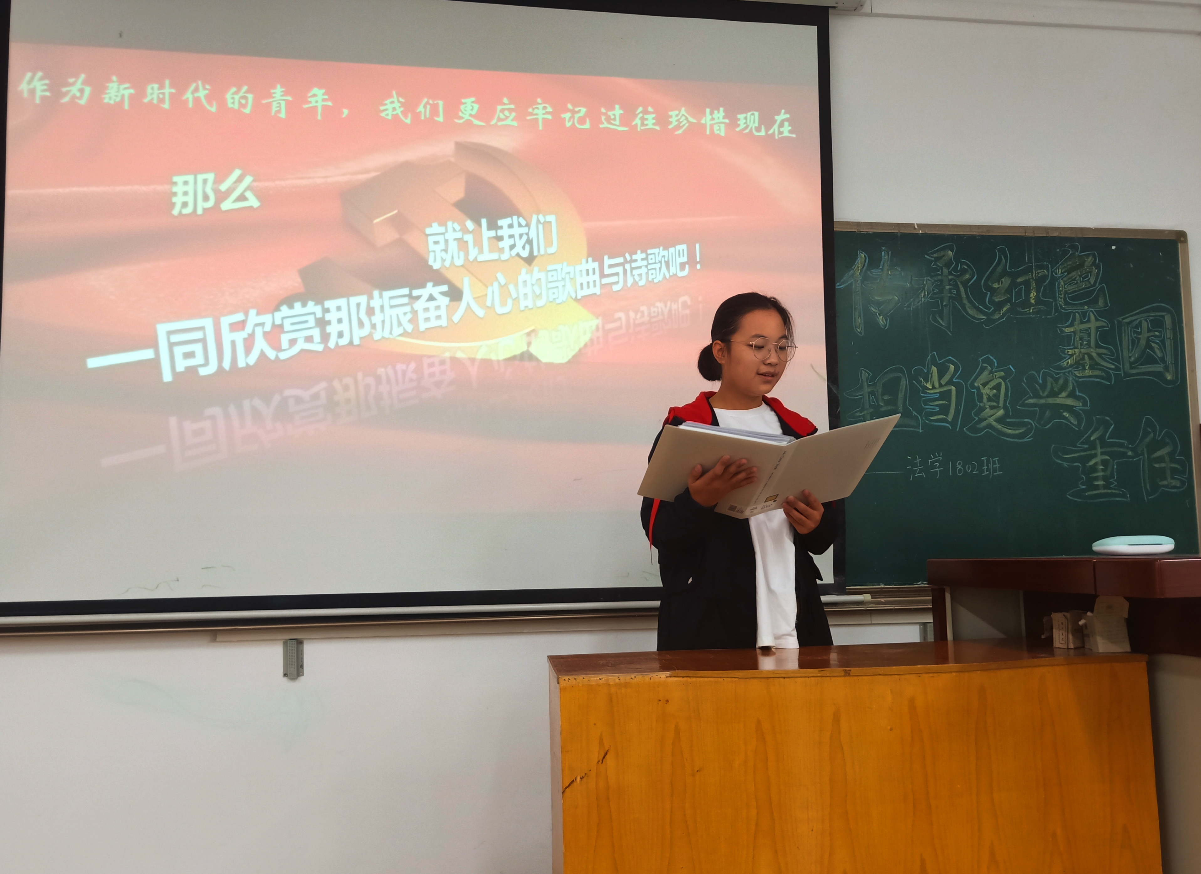 10月17日下午,法学1802班所有同学准时到达3303教室。首先,追溯建国前红军长征的艰辛历程,重走长征路,通过家乡在长征路沿线城市同学为大家讲述红军长征的小故事,让同学们更加深刻的体会到革命之不易。接着,组织共同观看了《激荡三十年》系列纪录片第一集,并进行了观后的感想交流,深入了解了改革开放初期,邓小平等伟大的领导人为中国建设做出的巨大贡献,感受到祖国发展的艰难,了解到改革开放后祖国的飞速发展,科技成就,实力猛增,增强了同学们的民族自豪感。最后,通过朗诵《沁园春 雪》《七律长征》《可爱的中国》等红色诗歌,演唱《东方红》《歌唱祖国》等红歌,表达了对祖国的祝福与歌颂,激发了同学们的爱国热情,增强同学们担当复兴重任的使命感。