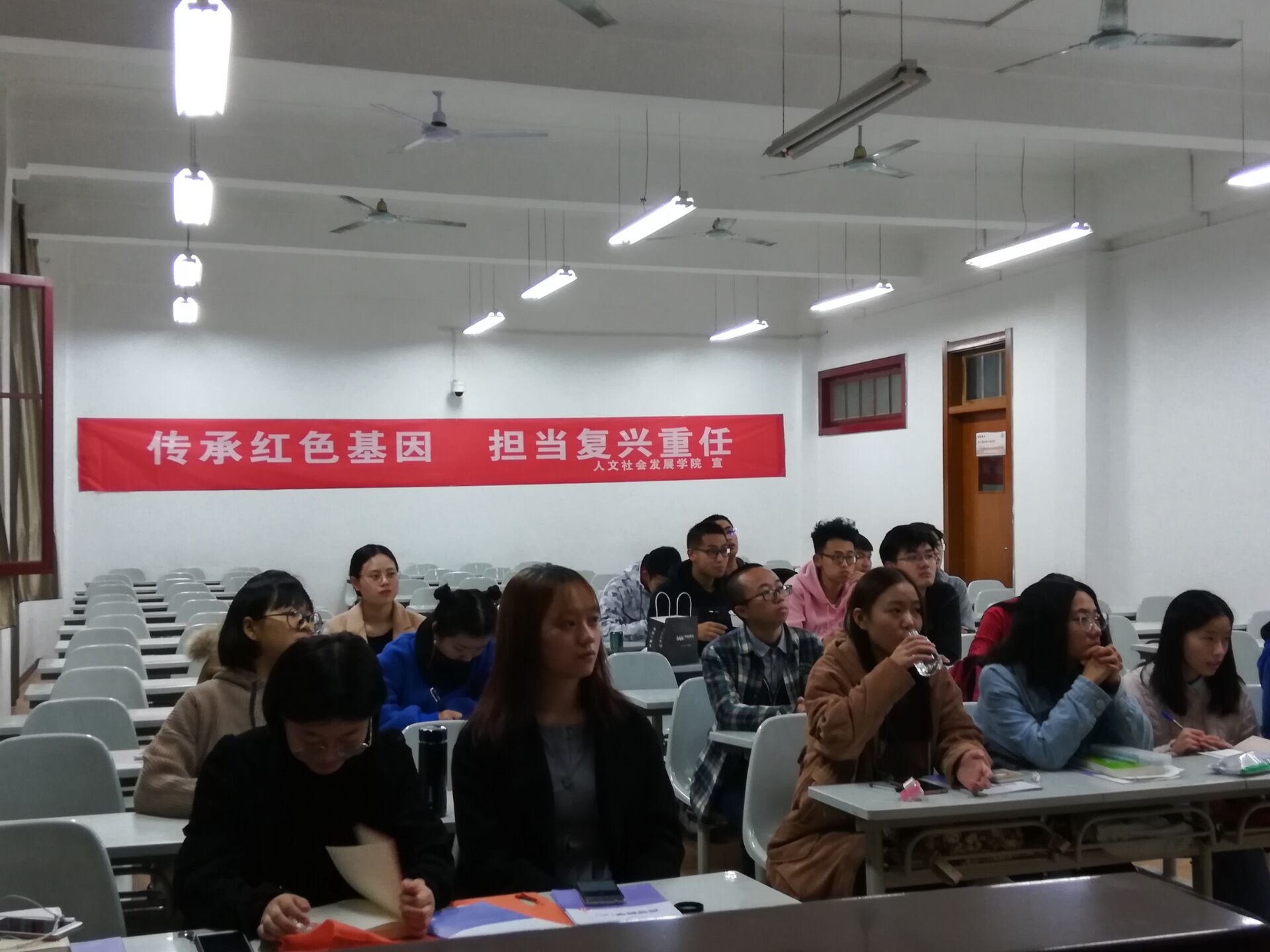 社会类1803班于10月17日下午6:30组织了主题为传承红色基因,担当复兴重任的班会。 通过田宇辰同学对十九大精神的简单报告,同学们了解到了新时代新主题老员工的任务。通过何磊同学的主题演讲和吴姣姣同学的演讲,同学们了解到新时代我国形势依旧不容乐观。通过红色经典影片的观赏,同学们热血沸腾。班会上,各项活动有条不紊,到场同学纪律良好,能认真听讲,认真观影,积极响应主持人和演讲人的号召,大胆发言。