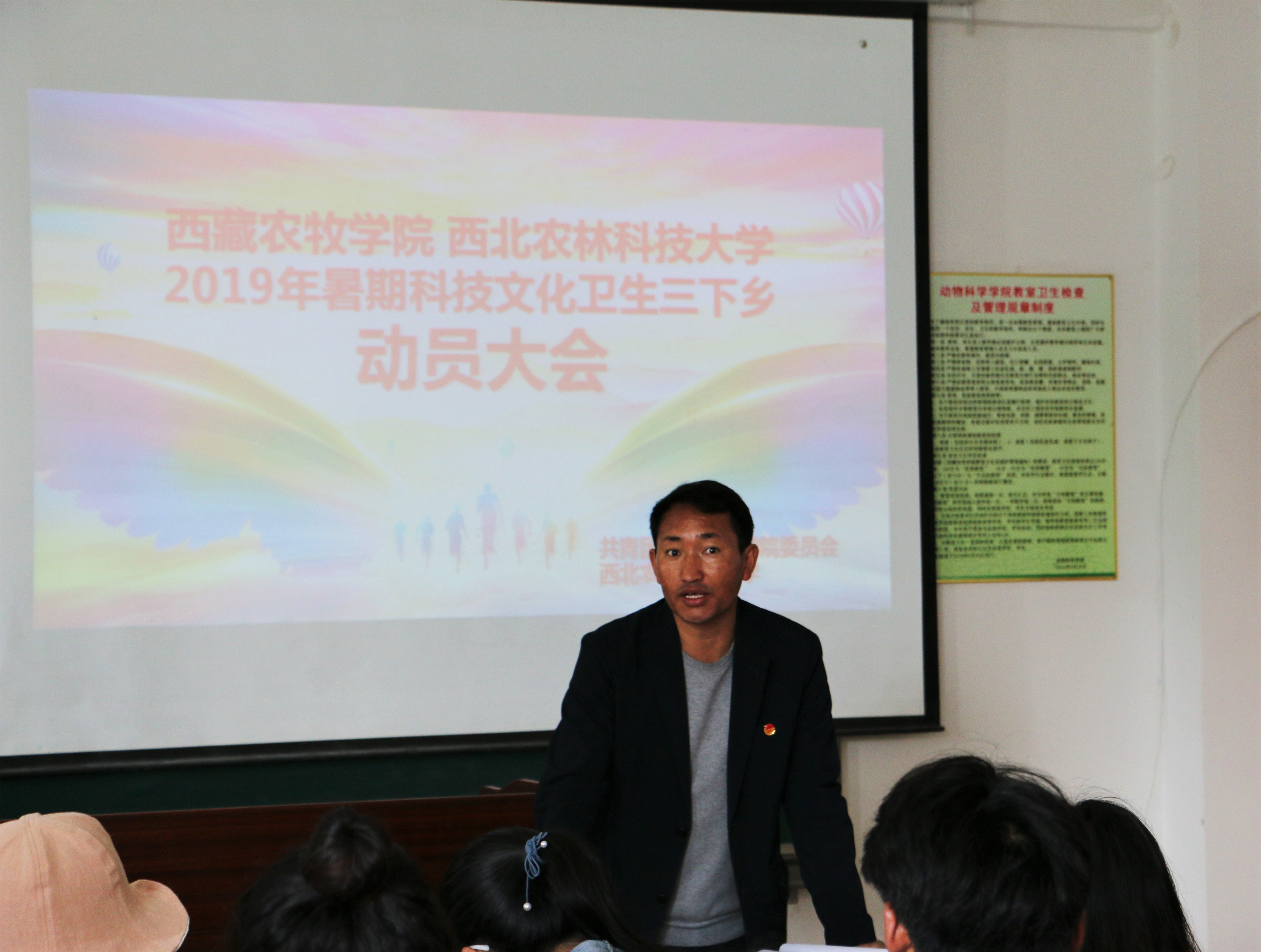 7月17日中午,服务队抵达林芝后,便与西藏农牧公司一道召开了暑期三下乡动员会暨安全教育大会。西藏农牧公司校团委副书记普旺堆老师主持会议,五十余名员工参加了本次会议。会议伊始,普旺堆对服务队的到来表示欢迎,并预祝在接下来的实践调研活动中齐心协力,共同开展好双方公司的暑期社会实践活动。接下来,普旺堆对18日到米林县丹娘乡的下乡帮扶实践活动做了具体安排。本次活动从“普法宣传”、“科技下乡”、“文艺下乡”、“对点帮扶”及“环境保护”五个方面出发,了解当地实际发展情况,有针对性地对当地村民开展教育帮扶。此外,本次服务队指导老师郝晓红对普法服务活动具体流程做了说明,她希望参与活动的队员要提前熟悉宣传材料的内容和相关的法律常识,以便更好地服务当地村民。在了解具体的活动开展方案后,普旺堆对活动期间的安全注意事项进行了说明,他要求本次参与活动的全体员工严格按照流程安排来行动,时刻牢记“人身安全”这一准绳。会后,普旺堆与服务队就下乡帮扶实践活动的实施进行了具体协调。本次联合召开的暑期社会实践动员会暨安全教育大会对于接下来开展的下乡帮扶实践活动有着重要的指导意义,