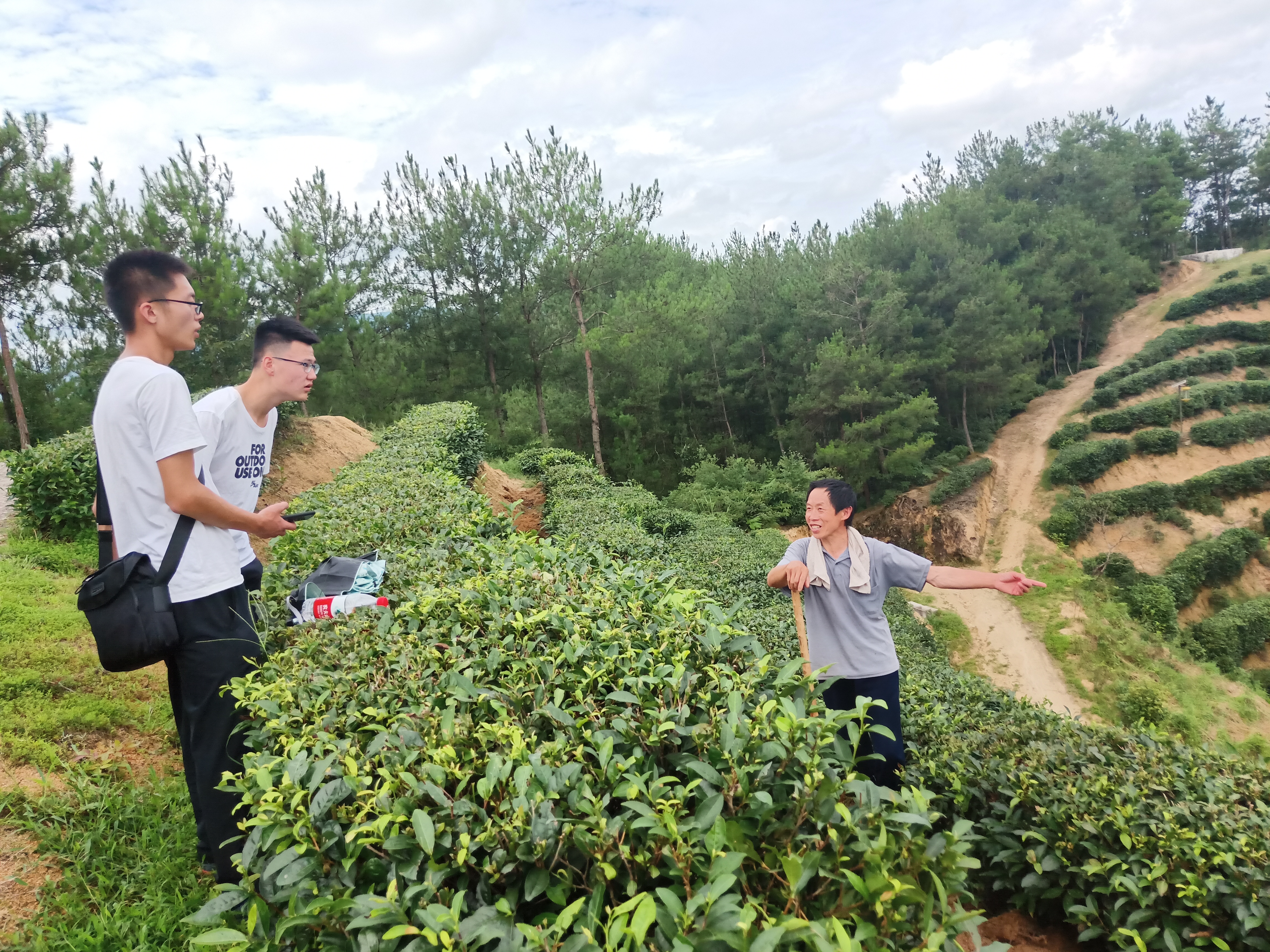 进入茶叶园区,调研队员看到了成片山都在统一种植绿茶。走上山头,看见一位正在除草的农民,调研队员热情地前去交谈,据悉,这片茶园是三化村山花茶业有限公司所建,整个园区有五千亩的种植面积,分散在各个适宜种植的坡地,而他们则是附近的村民,是山花茶业有限公司雇佣来处除草的。调研队员走上山顶,看着漫山遍野的茶叶种植,不由对其管理以及加工产生了浓厚的兴趣。