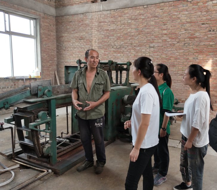 穿着整齐的绿色队服来到酒厂门口,和安保人员简单交流说明来意后,按着其所指方向来到了酒厂销售部负责人的办公室。负责人在听完我们的自我介绍后热情邀请我们坐下,并开始了与我们的访谈。根据负责人介绍,酒厂所制作的酒除了生产自己的贾家庄酒外,还为很多其它酒业公司代加工,提供原浆酒,如著名的洋河梦之蓝酒等等,由此可见其销路畅通且广泛。同时,酒厂制酒所需的原料小麦也基本由贾家庄自己供应,算是自产自销了,这样也就在农业与工业之间搭起了一座桥梁,既使村里的农作物有了销路去处,又为制酒提供了更可信的原料。此外,酒厂里的工作人员基本都是本村村民,从而解决了很多村民既想兼顾家人又想有相对好的收入的问题。