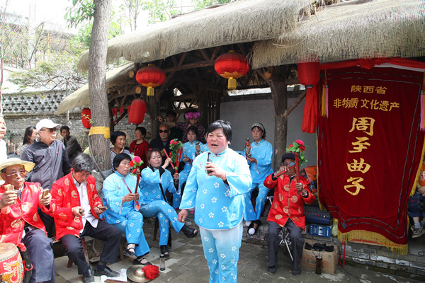 宣传单主要介绍了民间文化的四种表现形式,民间文学、民间表演艺术、民间美术和民俗文化。队伍成员在街道上或走进村民家中,发放宣传单并作讲解。宣传过程中,我们很幸运地看到了陕西省非物质文化遗产——周至曲子的表演。演员们以细腻的表情和用心的吹拉弹唱吸引了很多观众前来观看。我们和几名休息的演员聊天时得知,年轻人对周至曲子兴趣不高,需要年轻人来学习并继承周至曲子。