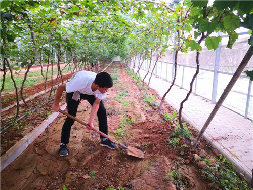 这已是本月的第三次活动。下午3点,队员们来到杨凌君渡农业专业合作社。拿着铁锹走进葡萄大棚,开始了这一次的劳动。这一次的主要任务是对浇过水的葡萄进行翻土。在葡萄浇水的过程中土壤会形成许多小渠沟,为了便于葡萄更好的生长,需将土壤翻平。在李师傅的讲解和示范之后,队员们开始实际操作起来。