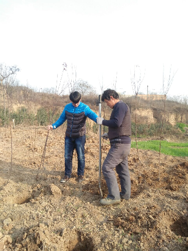 下午2点村助来到陵东村村委会与村主任交流具体的工作,了解最近村里的各项事物,并针对村里的一些问题提出自己的看法。随后跟随数名村民前往指定地点进行植树活动。大家首次先将树苗从大棚中移到田地里,然后村助和志愿者扶好树苗,与村民共同劳作,将树苗“三点一线”对齐植入指定地点。