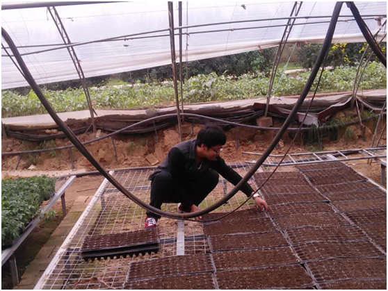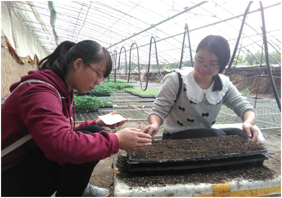 早晨9点左右,田园使者们乘坐6路公交到达了杨凌向阳果蔬合作社。一到目的地,大棚里正在育苗的阿姨热情的接待了使者们。通过一番交流,阿姨给使者们安排了一些工作。今天使者们的任务主要是育苗。由于使者们事先并不会育苗工作,所以只能由合作社阿姨进行示范教导。阿姨首先在大棚里把基肥装盘,其次将装有基肥的几个育苗盘堆叠在一起,然后从上往下压,在原有的基肥里就会出现一些凹坑,接着把西红柿种子放到凹坑里,最后再倒入少量基肥扒平。待把所有的盘子弄完后放到大棚指定位置。刚开始使者们在一旁观看学习,阿姨一边育苗一边给使者们讲解要点及注意事项。经过一番学习,使者们清楚了育苗的步骤及其要点,开始两人一组进行育苗,男生主要负责把有种子的育苗盘搬到空旷的地方,女生则学着阿姨的样子,重复着压盘、放种子、扒平的工作。起初大家动作生疏,效率低,但很快便从实践中获得了育苗的要领,能够娴熟操作提高了工作效率。工作的同时使者们与阿姨们沟通交流,从中了解到每一粒种子至少3毛钱,而一袋种子有1000粒,小小一袋毫不起眼的种子不菲的价格不禁让使者们更加珍惜手中的种子,生怕一不小心弄丢一粒。