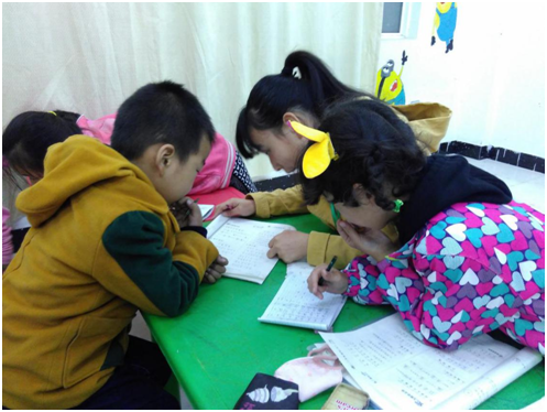 支教工作将要结束之际,家长们一般都会来接孩子们回家。由于作业较多,三年级一班杜可欣同学在规定的辅导功课时间内未完成作业,队员姜媛媛为缓和家长焦急的情绪,主动和家长沟通了解孩子的具体情况。杜可欣家长说:“欣欣写作业比较慢,在家基本上由于干扰太多,她不会主动去学习,而且由于我和她妈工作比较忙,平时没有时间顾得上她,只有在这里,有老师们的监督,她才会安静下来好好写作业,真的很感谢佳亿以及每一位支教老师。”