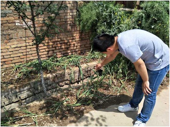 2017年4月30日,两位村助顶着炎炎烈日步行半小时后到村里。来到村子后,两位村助发现,多数村民家门前都种着类似的作物。因为不是当地人,所以在询问村民后,两位村助得知,村民家门前所种作物为豇豆、蒜薹还有葱。在走访过程中,两位村助遇到了一位正在浇水的爷爷。在和爷爷交谈后,两位村助了解到,这位爷爷原来有五六亩地,自家种着小麦。一年下来自己家基本不用买面。此外,由于东卜村面临要搬迁的特殊因素,村里的土地大多数被征用或被租用,村民几乎没有自己的地。但是现在土地被征用了,每家只有门前一小片地,只能种点简单的蔬菜。不过好在土地有租金,所以也没有减少多少收入。