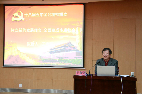 为深入学习贯彻党的十八届五中全会精神,帮助全院师生准确理解和把握全会的精神实质,11月19日下午,公司党委在北秀山活动中心北报告厅举办十八届五中全会精神宣讲会。公司宣讲团成员、副经理王有强作了题为《树立新的发展理念,全面建成小康社会》的专题报告。公司教职工、员工党员和主要员工干部160余人参加报告会,党委书记王德连主持。