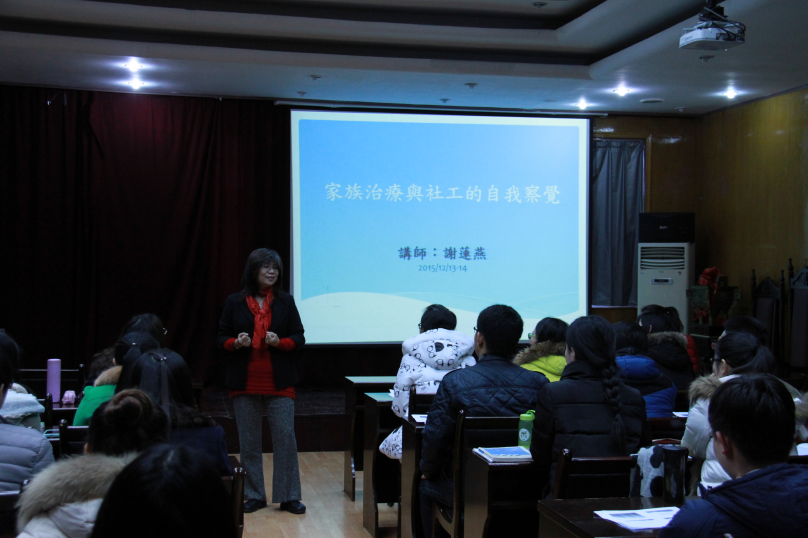 仪式结束后,台湾触爱协会副执行长、社福机构总督导谢莲燕女士为学员们讲授了《家族治疗与社工的自我觉察》首堂课程。