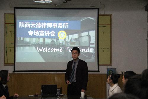 3月16日晚,陕西云德律师事务所在公司208会议室举行了就业实习基地签约仪式暨招聘宣讲会。公司党委副书记常振山,法学系主任郝晓红,陕西云德律师事务所代表,以及公司法学专业部分同学出席了活动。