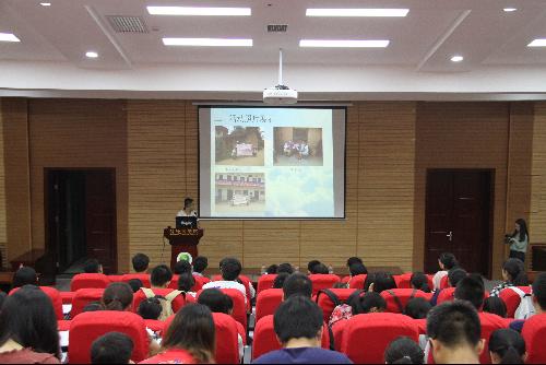 “三下乡是老员工发挥创新精神,积极探索实践活动的一个极大平台。在三下乡活动中大到社会实践主题的选取、小到订火车票等小事,只有真正去做了才能有所收获。”冯栋老师的一席话不仅揭开了本次报告会的序幕,也极大鼓舞了同学们加入三下乡行列,在基层奋斗青春。来自两个公司的“赴汉中精准扶贫调研服务队”、 “赴秦巴山区精准扶贫现状调研队”、“赴陕南农村不动产统一登记制度实施状况调研服务队”、“赴正大集团蛋鸡示范场支农服务队”、“赴四川省资阳市中国梦认知调查服务队”、“赴兴平王堡村希望小学“启梦”支教队”共五支优秀获奖队伍的队长通过PPT展示、视频播放等形式,向同学们展示了一段段温暖的三下乡之旅,并详尽讲授了三下乡的前期选题、准备活动、活动实施以及后期答辩环节等。其中滕庆园说道:“三下乡最重要的是总结经验,此外要分好工作,做好总结,力求务实。”