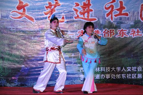 授牌仪式后,师生们将课堂搬进社区,开展了“校园文艺进社区”活动,与邰东社区居民共同上演了“祥和端午,福满邰东”为主题的文艺晚会。本次演出共有40余名师生参加,农业历史文化研究所郭风平教授演唱了黄梅戏《对花》和秦腔折子戏《花亭相会》,公共管理系戴瑾老师表演了《东方舞韵》,其他师生还表演了中华剑术、流行歌曲、关中民歌等节目,精彩的演出博得邰东社区居民的阵阵掌声。