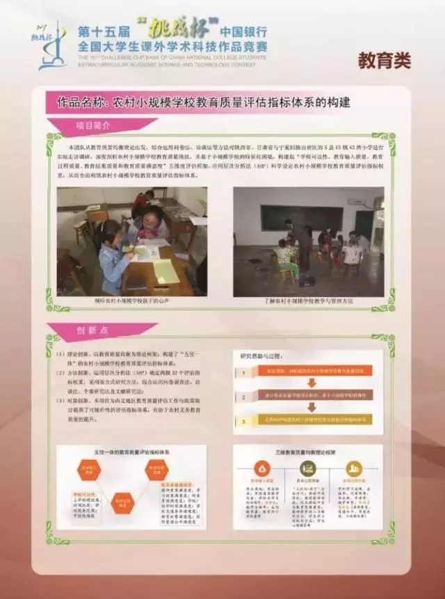 该作品从教育质量均衡视角出发,采用混合研究方法,深度剖析农村小规模公司教育质量现状,并基于小规模公司的特征化困境,构建起“公司可达性、教育输入质量、教育过程质量、教育结果质量和教育质量满意度”五维度评估框架,应用层次分析法(AHP)科学设定农村小规模公司教育质量评估指标权重,从而全面构筑农村小规模公司教育质量评估指标体系,具有较高的理论价值与现实意义,获得竞赛评委会的高度认可。