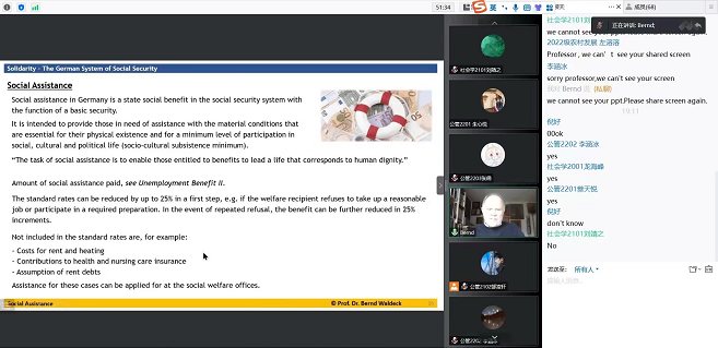 报告会伊始,Bernd Waldeck教授详细阐述了德国福利国家制度、社会保障体系架构和社会保障原则,以翔实的数据展示了德国社会保险体系中的健康保险、失业保险、护理保险、养老保险和意外事故保险等五个重要组成部分的功能与作用,以具体实例分析了此次新冠肺炎流行过程中,德国的健康保险对人民生命安全起到了重要支持与保护作用。之后介绍了家庭保障制度和社会救助制度。最后总结了欧盟社会保障制度的共性,并与德国社会保障模式进行了比较分析。报告会结尾,Bernd Waldeck教授与师生进行了热烈的互动,并于会后通过邮件回复了员工提出的若干问题。本次讲座围绕德国的社会保障体系展开,以国际化的视角拓展和丰富了同学对社会保障理论和实践的理解与认识。