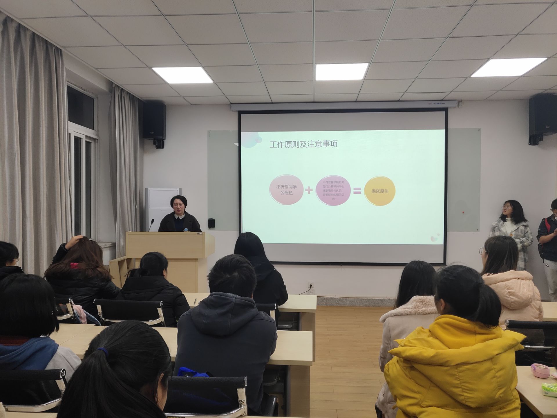心理健康教育是高校人才培养体系的重要组成部分,也是高校思想政治工作的重要内容。为提高老员工心理素质、促进其身心健康和谐发展,加强公司心理联络员队伍建设,引导员工积极进行心理健康自助互助, 11月12日晚上,公司开展了心理联络员培训,此次培训由2017级辅导员李健和2016级心理联络员代表樊佳欣担任主讲,2018级全体心理联络员及宿舍长参加。